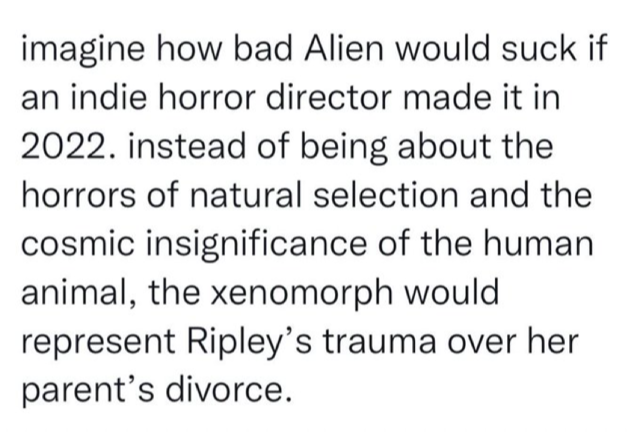 Yeah, man, imagine if an indie horror director in 2022 made a movie in which a man is face-raped and forced to carry a pregnancy to term? Thank god a male-presenting robot doesn’t assault a woman by forcing a rolled up pornographic magazine into her mouth, that would be dumb, and would definitely mean that Alien was about more than the “cosmic insignificance of the human animal.”